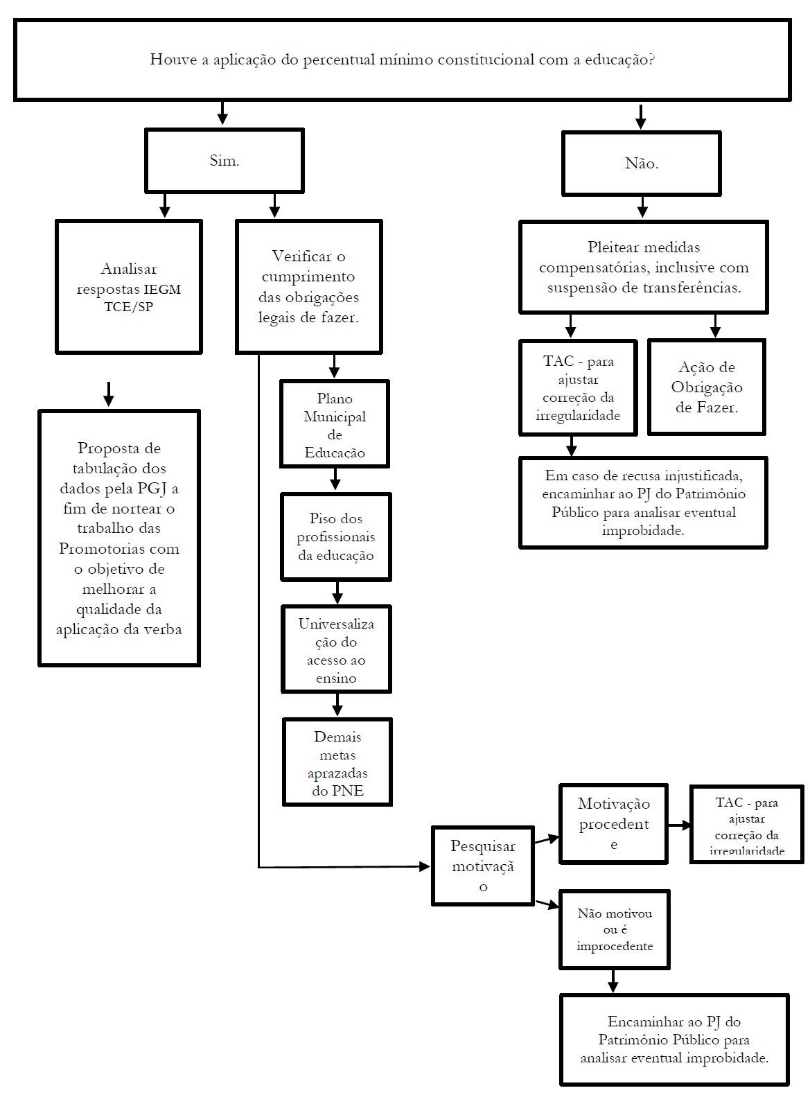 A novidade fica por conta de um fluxograma, que pretende orientar de forma simples e didática aqueles que fiscalizam as prestações de contas da administração pública. Ao responder uma pergunta inicial - no caso "houve a aplicação do percentual mínimo constitucional com a educação?" - são identificadas diversas ações a serem tomadas pelos membros do Ministério Público, que incluem desde a verificação de cumprimento das obrigações legais de fazer, a encaminhamento das contas ao Poder Judiciário.