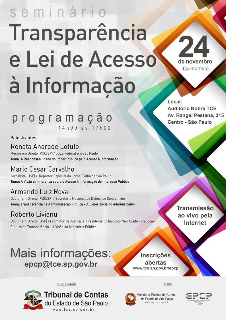 O MPCSP, em parceria com o Tribunal de Contas do Estado de Paulo, realizará na próxima quinta-feira, dia 24 de novembro, das 14h00 às 17h00, o seminário Transparência e Lei de Acesso à Informação, voltado aos gestores públicos municipais e estaduais, e aberto para o público em geral.