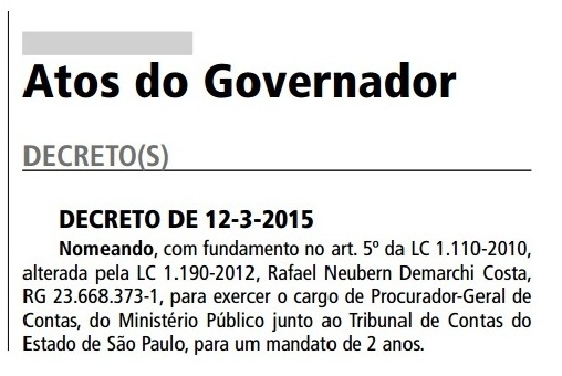 Mais votado pela carreira para compor a lista tríplice, o Procurador do Ministério Público de Contas, Dr. Rafael Neubern Demarchi Costa, foi nomeado na última sexta-feira (12/03/2015) pelo governador Geraldo Alckmin para exercer o cargo de Procurador-Geral. Sucedendo o atual Procurador-Geral do...