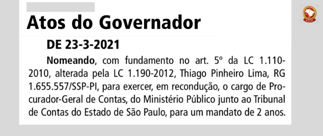 Nesta quarta-feira (24), foi publicado no Diário Oficial o decreto 23-3-2021 do Governador de São Paulo, Sr. João Doria, nomeando Dr. Thiago Pinheiro Lima para exercer, em recondução, o cargo de Procurador-Geral do Ministério Público de Contas durante o biênio 2021-2023. Ainda no mês de fevereiro, o...