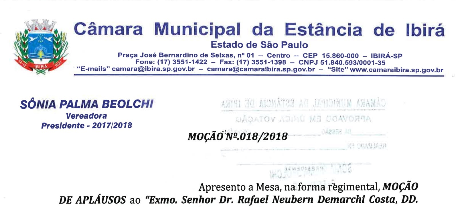 O Procurador-Geral do Ministério Público de Contas, dr. Rafael Neubern Demarchi Costa, foi agraciado pela Câmara Municipal da Estância de Ibirá com uma Moção de Aplausos, que é o reconhecimento por parte de representantes do poder legislativo a um ato notório praticado. Proposta pela vereadora Sônia...