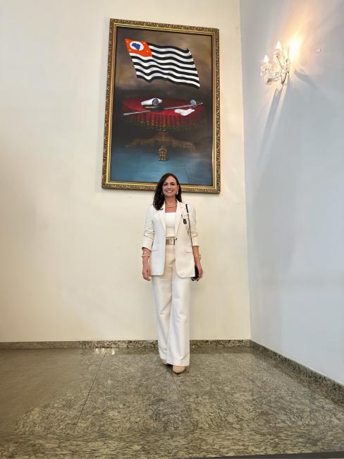 A chefe do MPC-SP recebeu a comenda pelas mãos do Secretário da Segurança Pública, Guilherme Derrite, e pelo anfitrião do evento, Coronel PM Gustavo Henrique Lopes Barbosa, Diretor de Tecnologia da Informação e Comunicação.