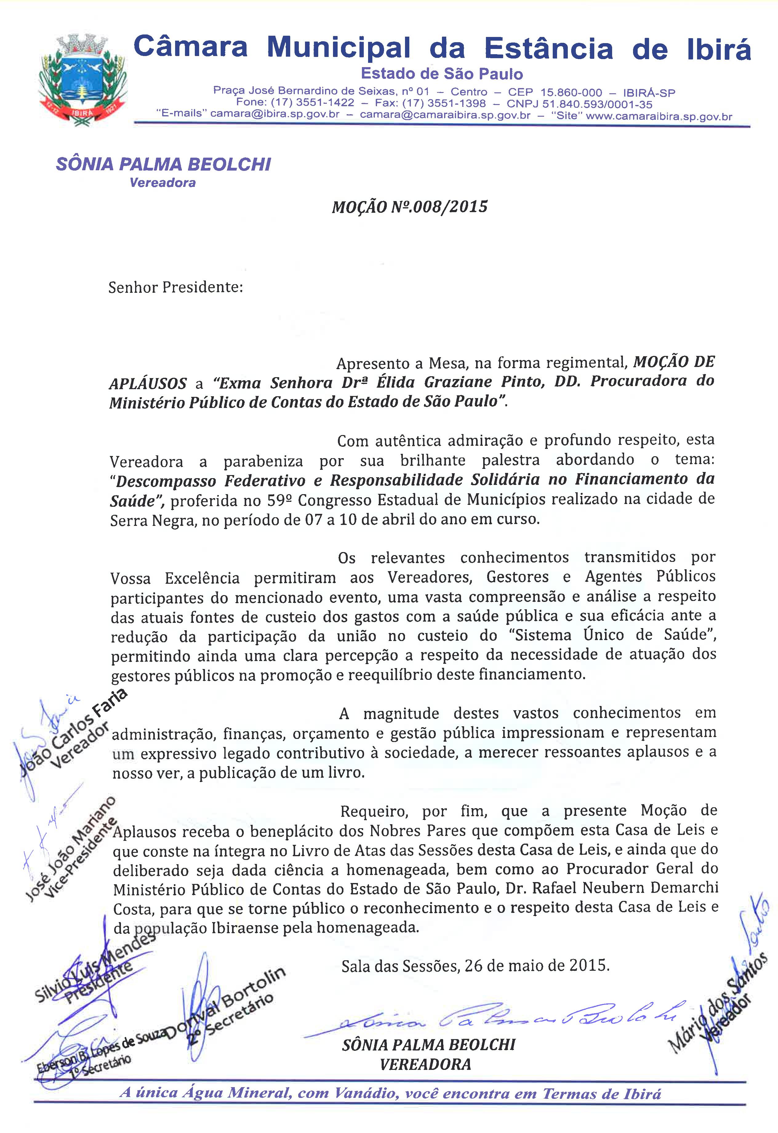 Proposta pela vereadora Sônia Palma Beolchi e aprovada unanimamente na 9ª Sessão Ordinária da referida Casa Legislativa, a Moção visa parabenizar o desempenho da Procuradora no 59º Congresso Estadual de Municípios, que foi realizado em abril na cidade de Serra Negra/SP. Durante a ocasião, Dra. Élida falou sobre as fontes de custeio dos gastos com saúde pública e sobre a correta atuação dos gestores públicos frente a isso.