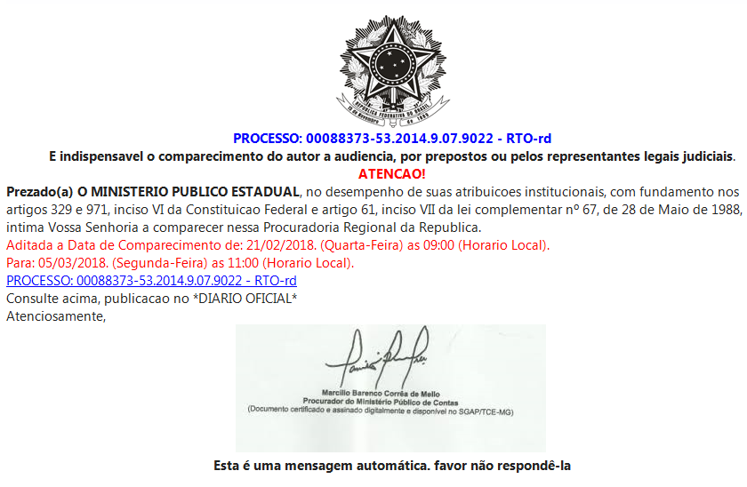 O Ministério Público de Contas do Estado de São Paulo vem através deste canal alertar a população sobre a existência de falso e-mail na internet convocando para o comparecimento de uma suposta audiência de um processo de nº 00088373-53.2014.07.9022 - RTO-rd.